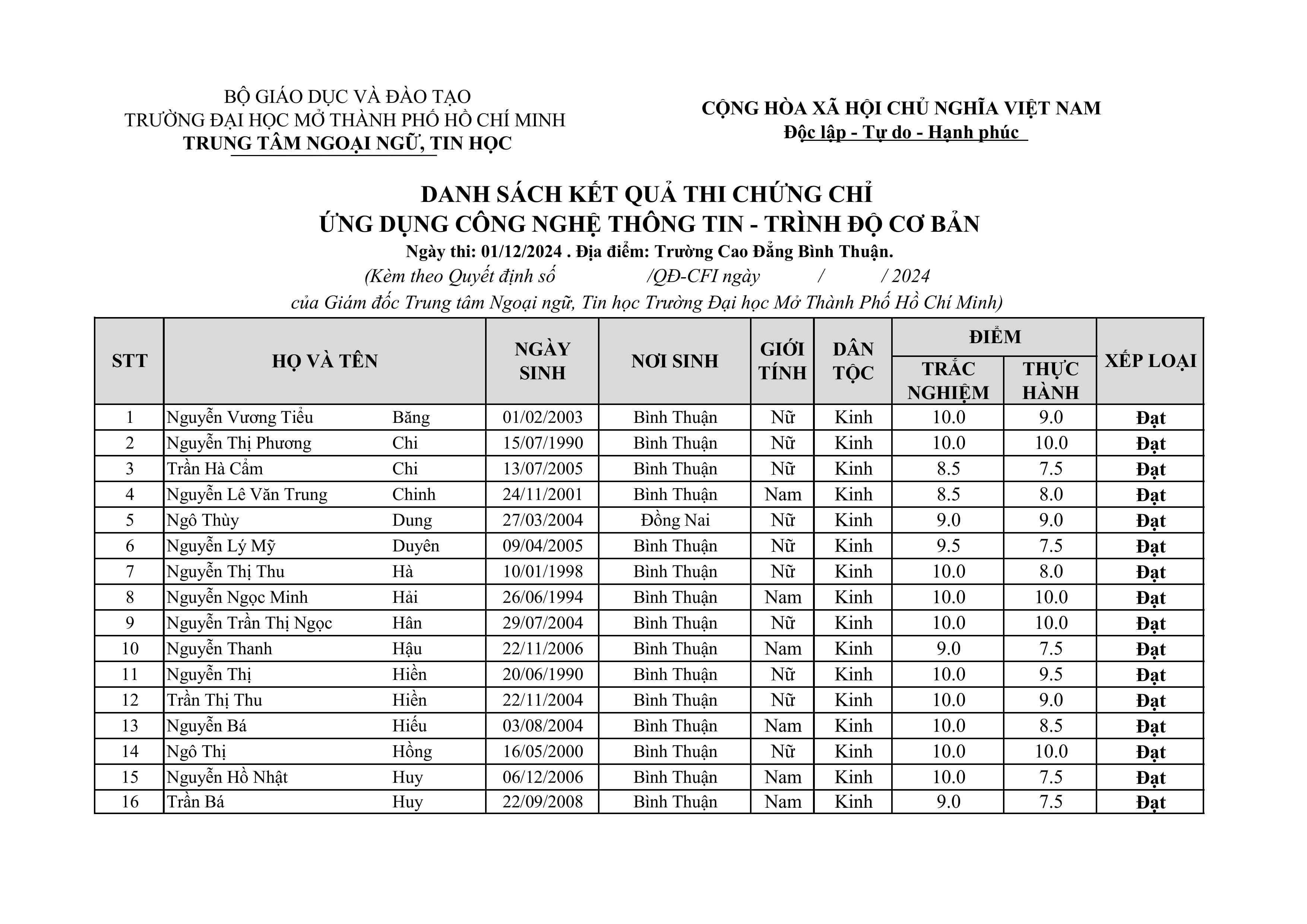 THÔNG BÁO KẾT QUẢ THI CHỨNG CHỈ CNTT KHÓA NGÀY 01.12.2024