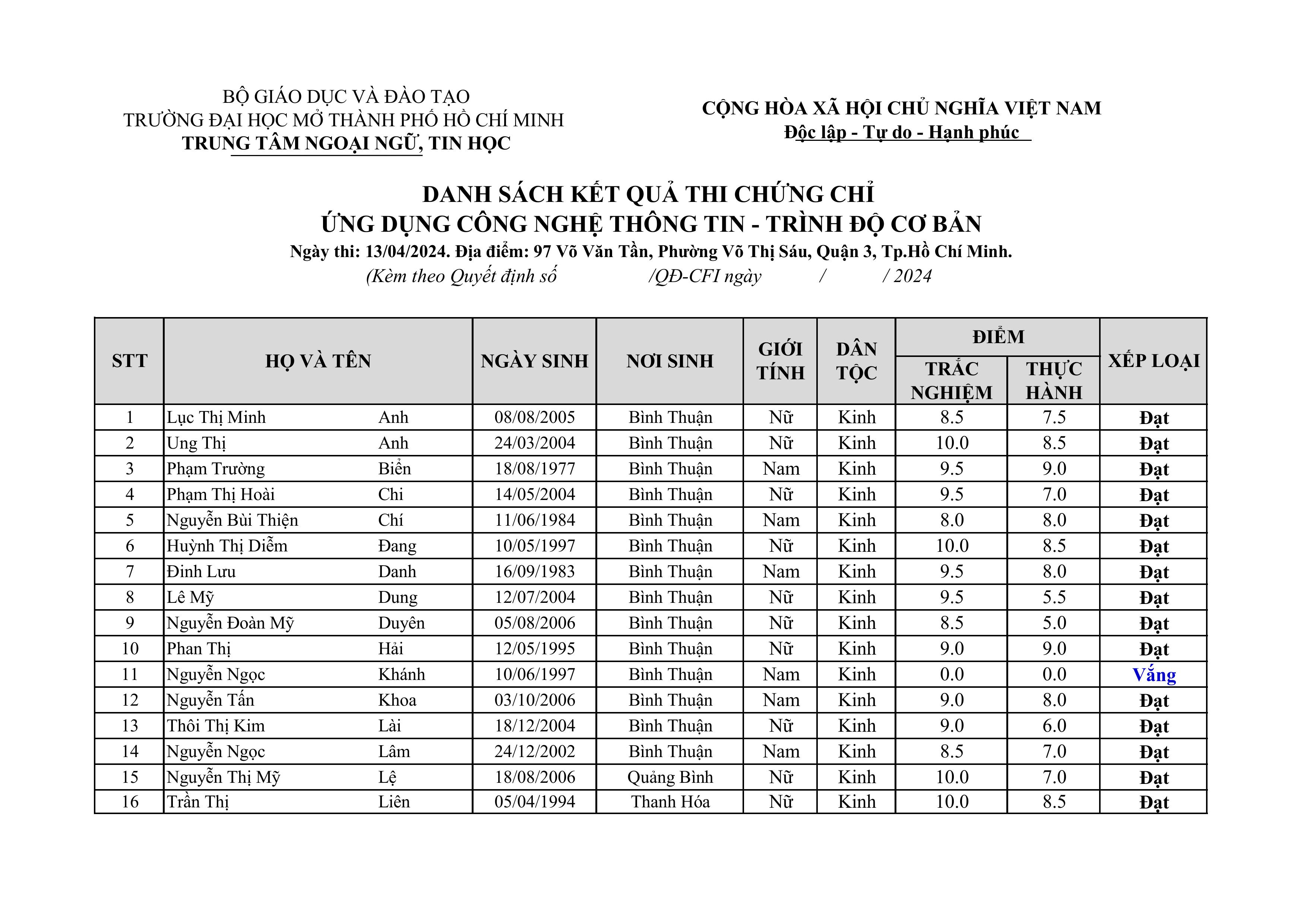THÔNG BÁO KẾT QUẢ THI CHỨNG CHỈ CNTT KHÓA NGÀY 14.04.2024