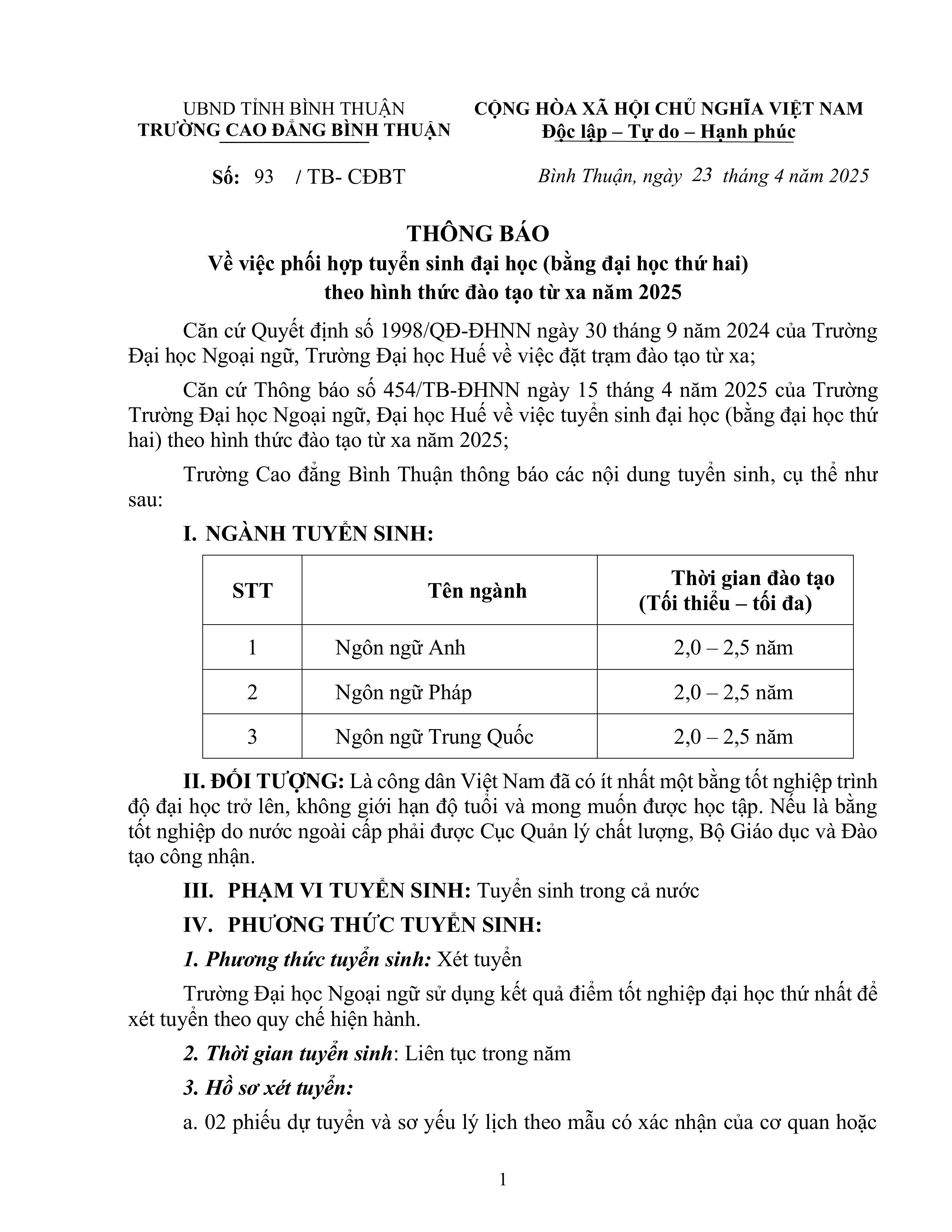 Thông báo về việc phối hợp tuyển sinh đại học (bằng đại học thứ 2) theo hình thức đào tạo từ xa năm 2025