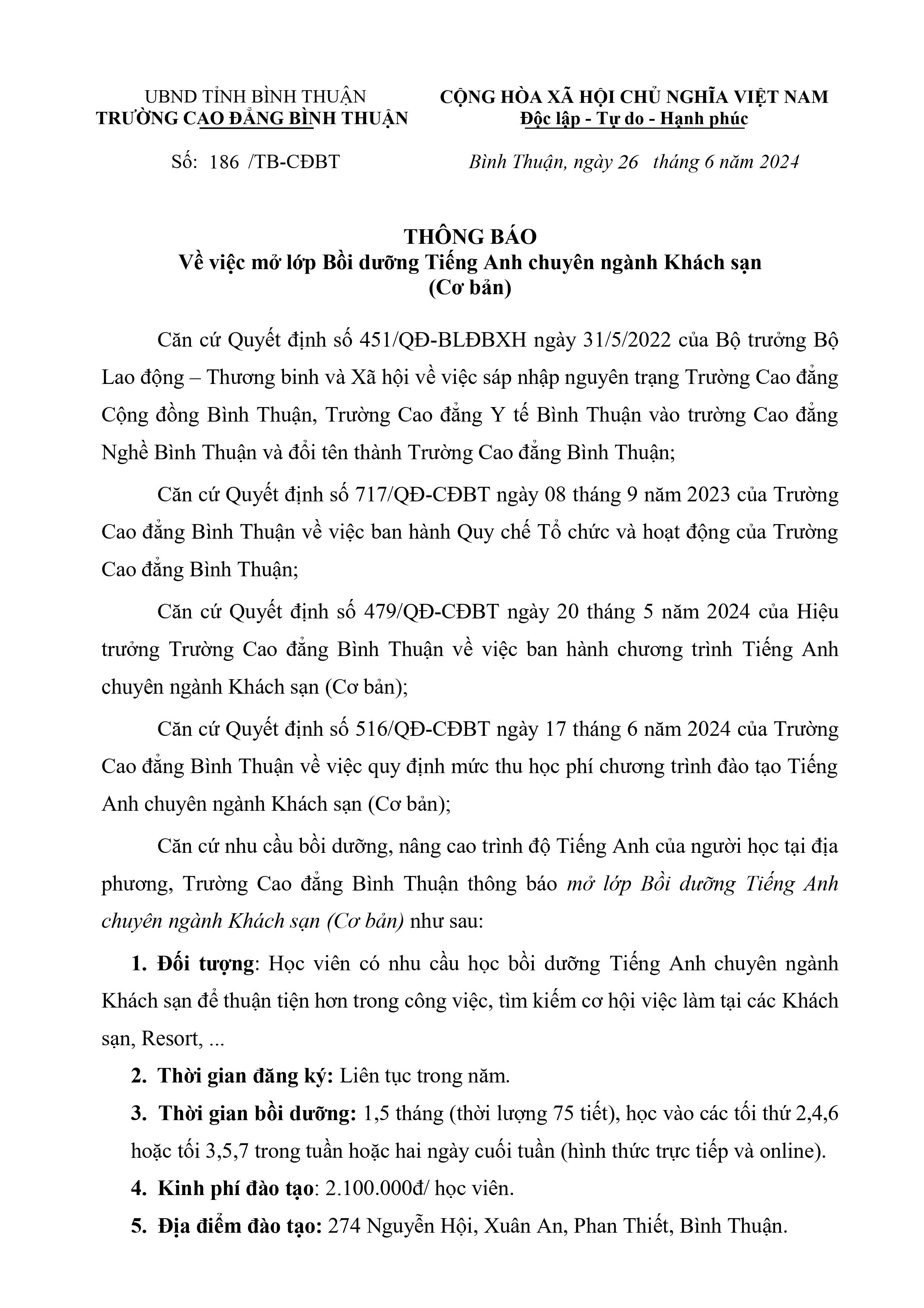 THÔNG BÁO MỞ LỚP TIẾNG ANH CHUYÊN NGÀNH KHÁCH SẠN (CƠ BẢN)