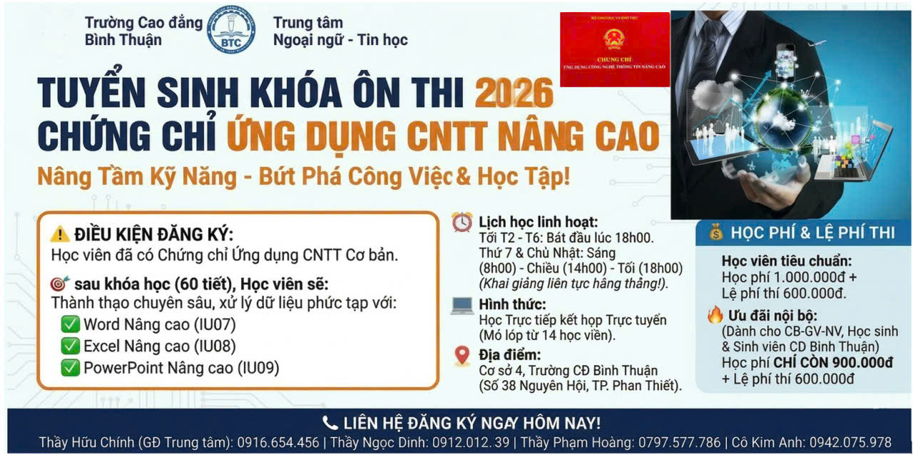Thông báo tuyển sinh các lớp ôn thi Chứng chỉ Ứng dụng công nghệ thông tin nâng cao - Năm 2026